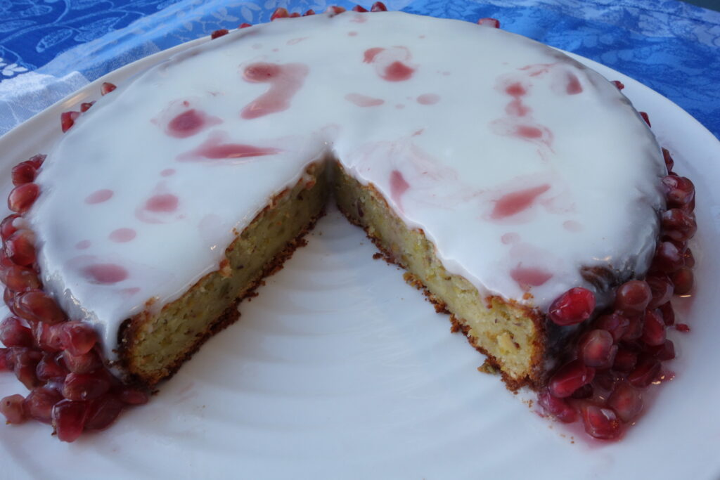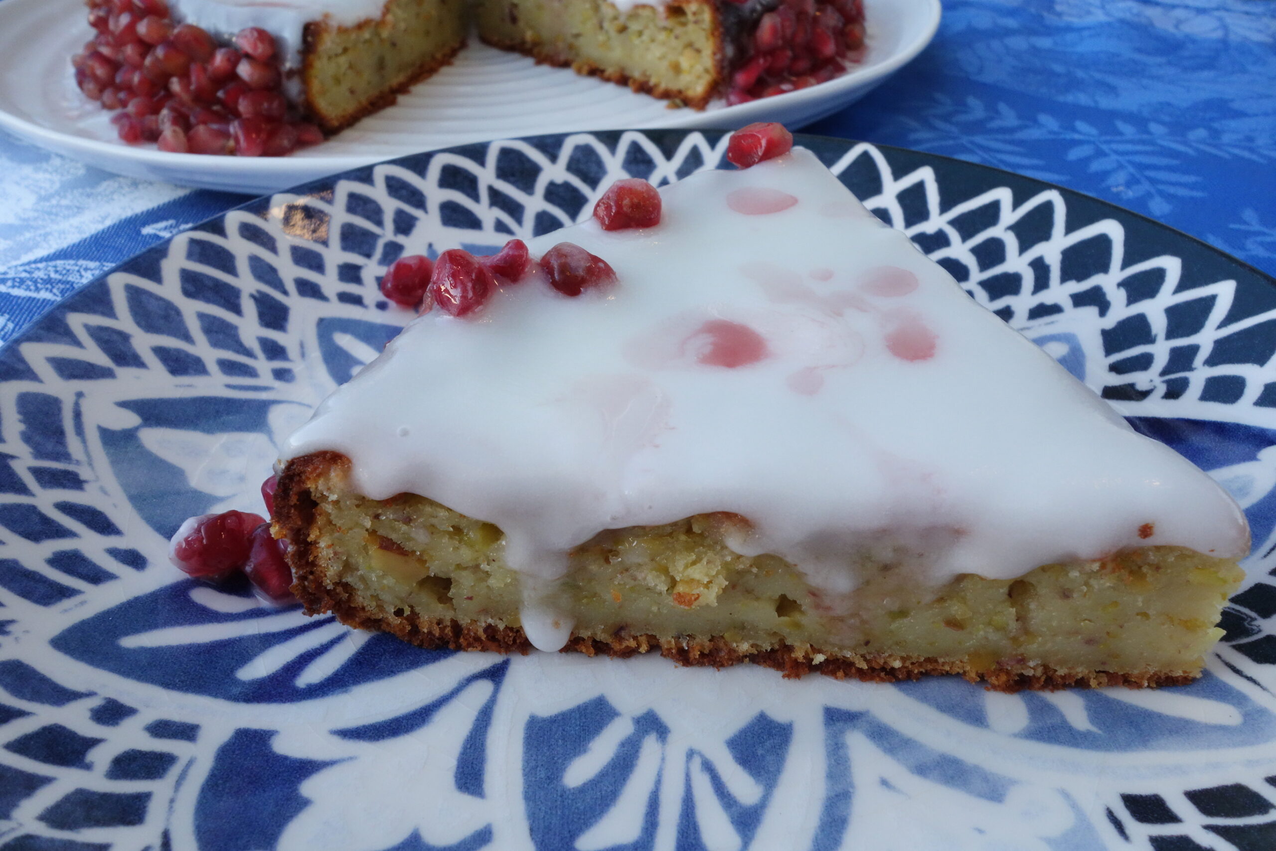 This Pistachio and Pomegranate Cake is a fun idea cake for spring and entertaining friends. Add a dash of Color like here the red of Pomegranate and the green of Pistachio.The pomegranate juice refreshes and is perfect for coloring icing the natural way.