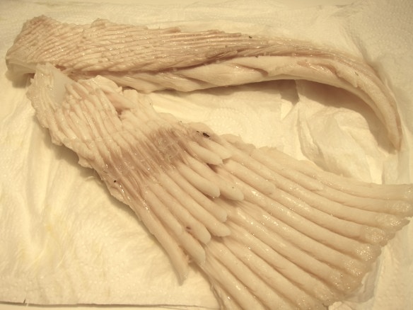 Then, cook the skate wings in the court bouillon for 8 to 15 minutes, depending of the size. Remove the skate flesh from the cartilage and the skin. Divide into six portions and set aside
