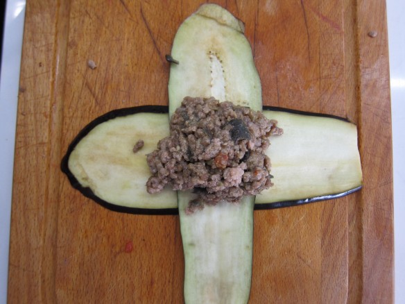 Rince and dry the eggplant slices. Make a cross with 2 of them and put a small portion of the lamb stuffing in the middle. Fold to form a bunddle and string with the chives already blanched, but not necessarily.
