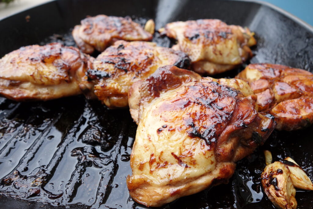 Preheat a large skillet or griddle over medium heat. Place the chicken thighs in your pan, cover, and cook for about 45 minutes in total, turning them several times and basting them with the marinade about 10 minutes before the end of cooking.
